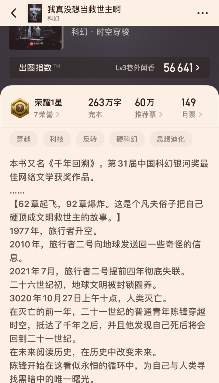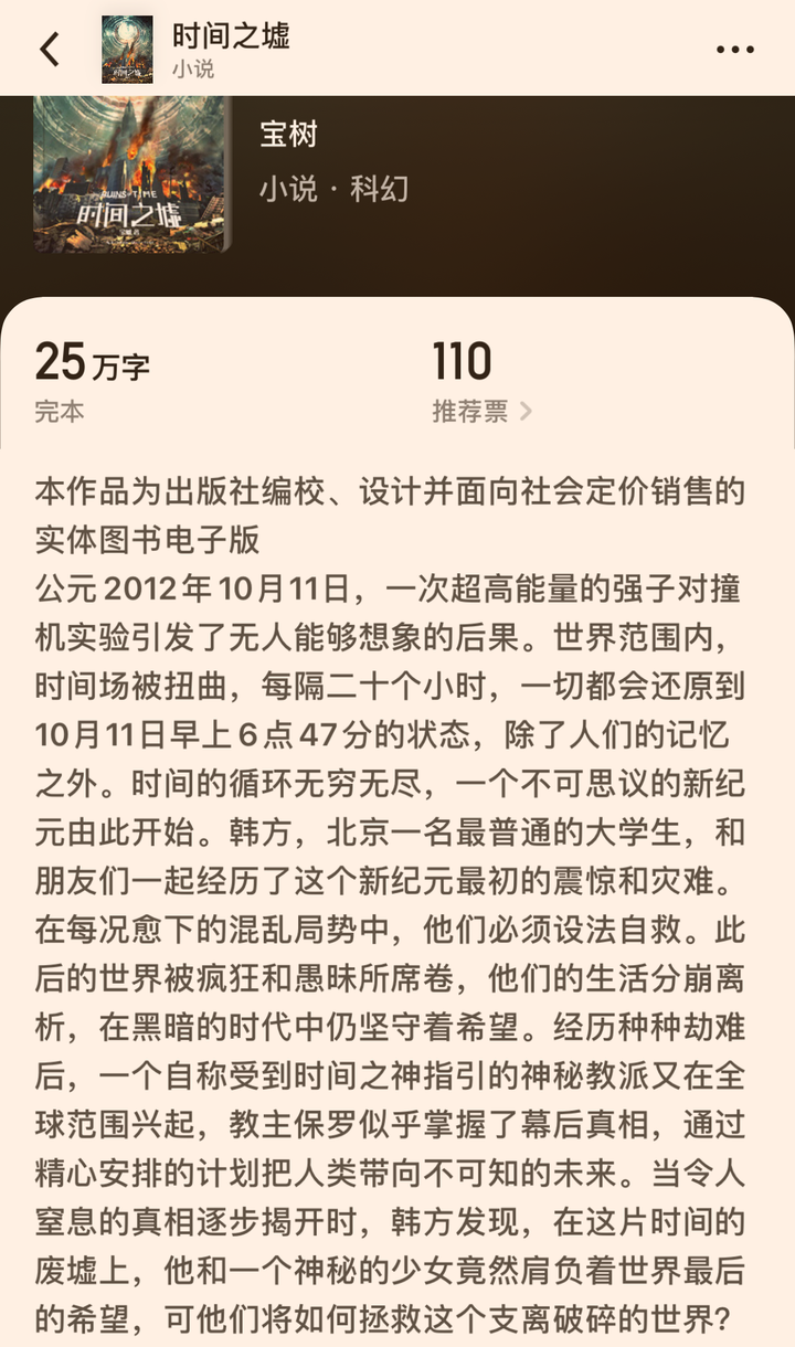 原答(还有一本我忘记名字了……讲的是主角玩游戏,游戏里的东西和角色可以具现现实的,印象深刻的是出现在现实世界的“登山的”女修仙者以及帽子?有记得的麻烦告诉我~谢谢) 更新:经网友提醒,是这本!!!节奏还是不错的,描写某个家族的精神传承时燃到我了。 19.《时间之墟》 |