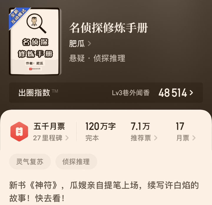 不太记得了,一个为了驱魔却不得不收集恶灵,为了抵抗恶灵不得不再次继续收集恶灵变得更强大的故事?恶灵心里mmp:“你不要过来啊”。 推! 很像另一本灵异小说,《我有一座恐怖屋》,这本也推的,还有《神秘复苏》也是妙蛙种子米奇妙妙屋的妙,这本还在连载中,我之前追着追着没耐心追了。↓ |