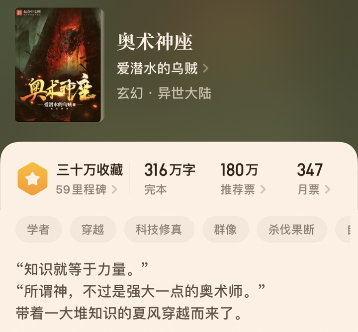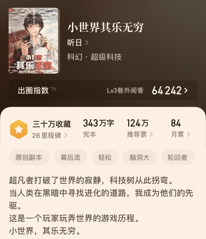 以前无意间看到的作品……作者已弃。但设定真的魔性又玄妙,明明你知道这玩意不对劲但就是疯狂上头?!?更神奇的是这小说里面还挺讲究逻辑的,不是瞎写的 24.剩下的不贴图了,有兴趣自己去搜哦。和《大王饶命》类似的犯贱主角(原回答《不合格的大魔王》——更新,错了错了划掉,这本大魔王的话是一拳超人+毒舌设定,文笔小白,不太合我喜好,我没看完放书架上给记岔了…… 我想推的是另一本类似的……忘记书名了,也是魔王设定,不过是异世界背景,有成长描写,文笔也很好。印象深刻的是主角一直摸鱼,后面去了趟龙宫?内容还涉及二向箔,不过作者坑了……如果我找到了就给大家po 上来) 还有,有点像《弥留之国的爱丽丝》的《神灵们的沙盒游戏》高智商副本游戏。 同类学霸黑科技文《学霸的星辰大海》,《学霸的黑科技系统》 无限流《末日乐园》《惊悚乐园》《无限恐怖》。 直播流《女帝直播攻略》,《西游直播间》也还可以,后期水,前期可看。 有体系与步骤的现代修行小说《神游》(作者对这个颇蛮研究的我记得,看了我感觉我真的能修……) 女频类也有《我家徒弟又挂了》《家兄又在作死》《师父又掉线了》同世界观同作者写的。 穿书不要男主要事业的《我有霸总光环》,不要男主要妹纸的《每天都在征服情敌》,重返青春和儿子一起上学的《我是校霸他亲妈》,这本小说最后那味道有点像《重返十七岁》了,蛮感人的 扩展更新———— 设定好的非网络小说推荐 1.《第七天》 |