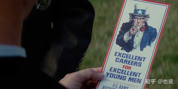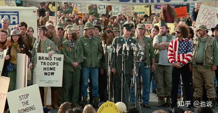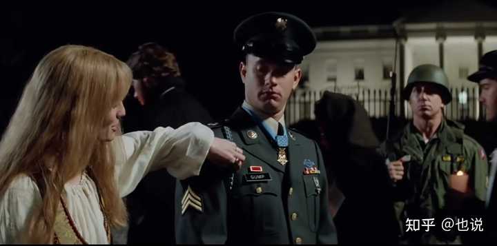 后面他俩聊天的画面也很有象征意义: 带着武器的军人站岗,围着他们走的是反战的示威人群。前景是代表两个势力的阿甘和珍妮,并肩拉着手在走。 象征了这些人其实都是底层美国人,本没有矛盾,只是被各自的“头领”指挥。 不管是去当兵的,还是反战的,在童年曾经是伙伴。 |