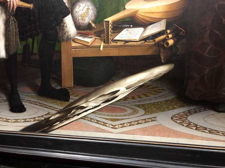 这其实是一个变形透视拉长的骷髅,你得移动到画面左边的特定位置,让你的视线与画作呈一个特定的角度,才能辨识出这个骷髅的原貌。 |