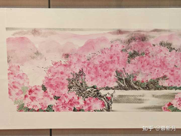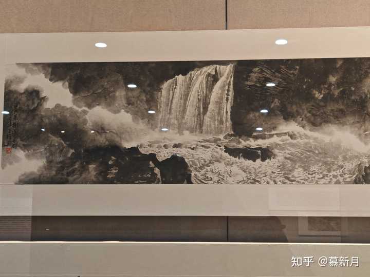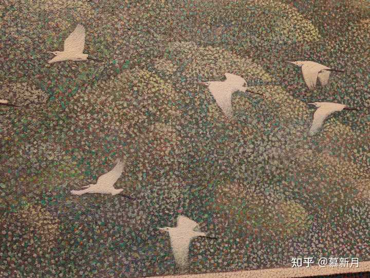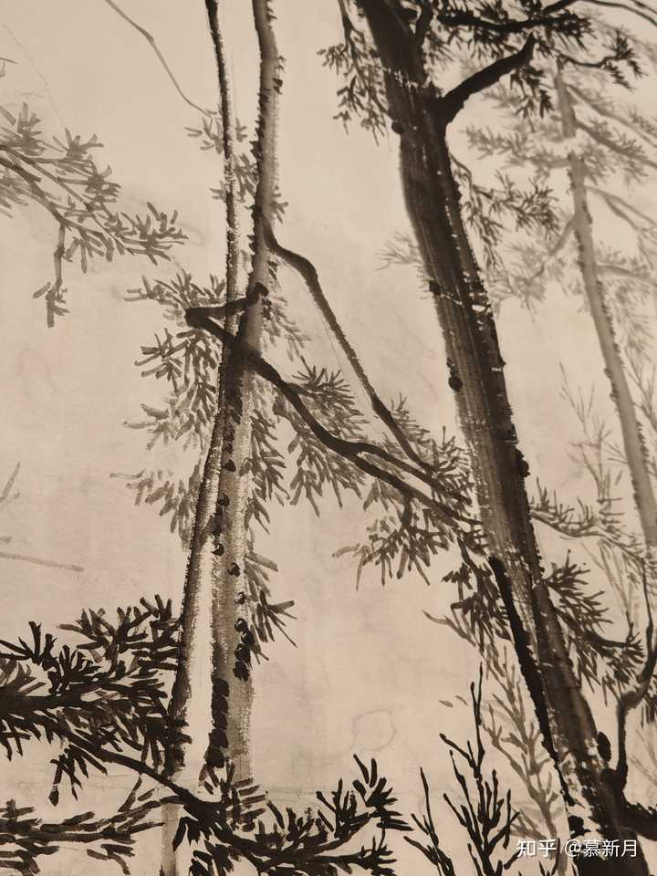 再比如这张 其实非常大,两米多,照片感觉不到什么,甚至还有点丑,你站在这张画面前会有一种走进树林的幻觉。 我们来看看国画功底和细节,我刚好拍了一张 |