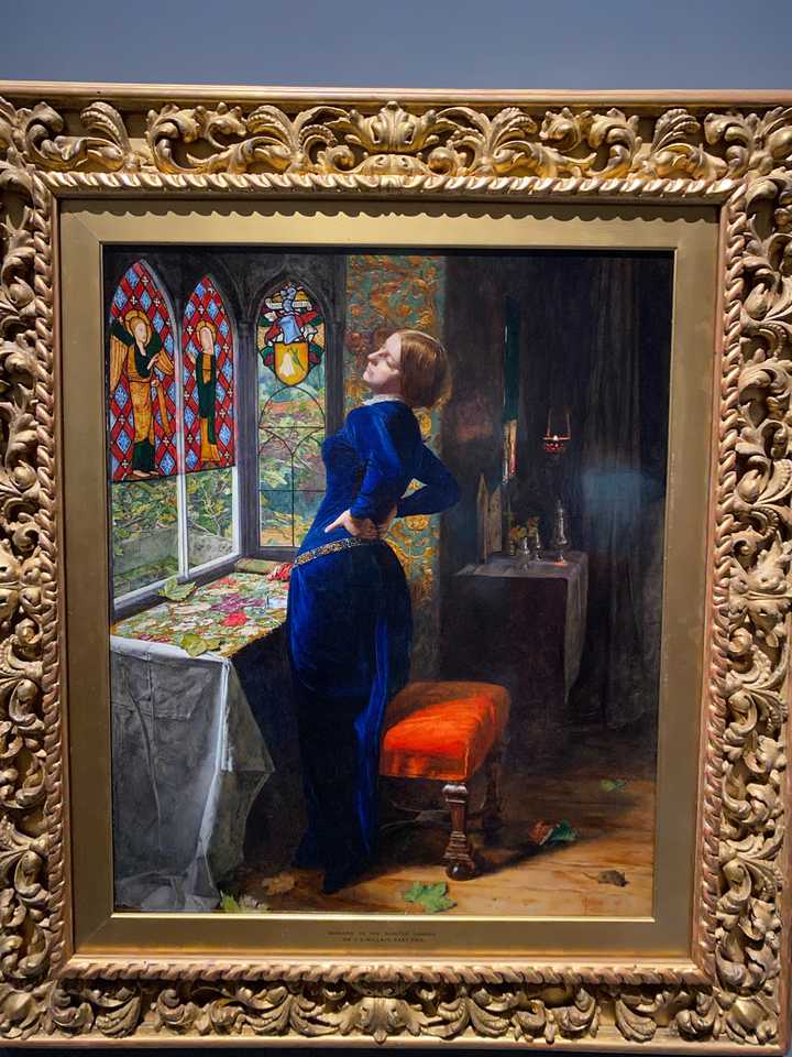 小汉斯·霍尔拜因《大使们》 真迹摄影 这些风格和元素都属于「虚空派」的死亡主题,本文就不做展开了。与这个话题最有关的是,你需要站在特定的角度才能看到画面所传达的信息,这也是只有看原作才能有直观感受的。 再之后,是光、材质、笔触等等。 屏幕是发光的,平滑纸张上的油墨是反射光的,而真迹呢,怎么说呢,既吃光又吐光。 你站的角度不同,你看到的材质的质感、颜料的颗粒、光泽、金箔的闪烁等等,都会因角度不同而改变,你能看到哪里是干笔擦过,哪个角落里有犹豫和补救。 同样的,画作每一处的细节也会因此而更加活灵活现,例如这幅米莱斯的「护城河畔的玛丽安娜」。 |