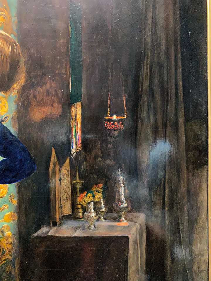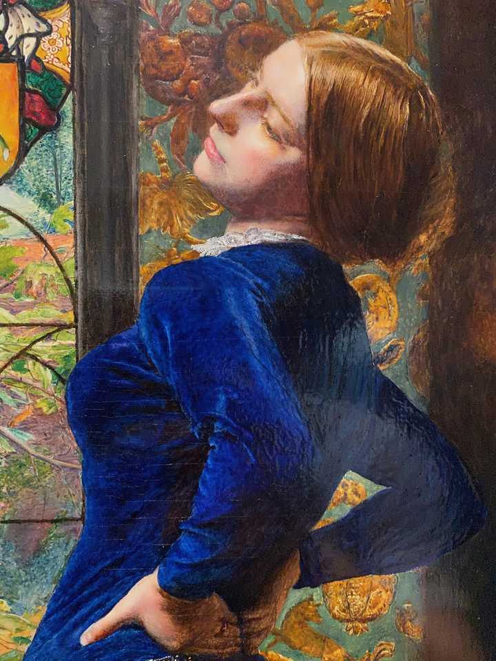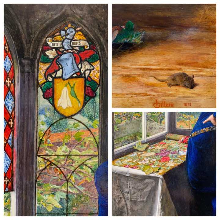 米莱斯 「护城河畔的玛丽安娜」 真迹摄影 抵近看,叶片的质感、彩绘玻璃的纹理、还有角落里那只小老鼠等等。 |