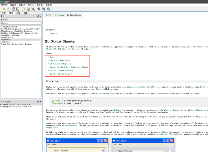 把Qt的所有标准控件给设计看, 告诉他不要做这些控件之外的控件效果. 要做也是控件之间的组合, 不要整出来什么奇奇怪怪的控件, 那个做不了的. 2. StyleSheet, QSS就是CSS. 没啥好学的. 打开Qt的Assistant, 搜索stylesheet |