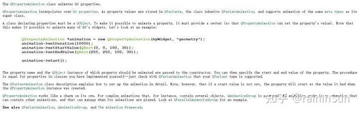 Qt 跨平台的 raster 引擎绘制就是先绘制一张图,然后丢给系统,把图绘制到窗口上,因为是在一张图上进行绘制,定义好图的像素格式就能直接跨平台。paintEvent 就是 Qt 留给我们在图上面绘制内容的接口。绝大多数复杂一点的控件都会使用 paintEvent 进行绘制。 上面利用 Qt 提供的 QPainter 绘制体系绘制了一个圆。如果想要成为一名合格的画图仔,学好 QPainter 相关的绘制体系十分重要。如果是初学者想看看 paintEvent 如何画界面,可以看看这个或这个小项目(大佬直接忽略),没有任何技术含量,代码写的也不行,仅仅是通过 paintEvent 画了一个类似 360 的界面和音乐播放器界面,只能说看看 paintEvent 如何画界面。 QPropertyAnimation |