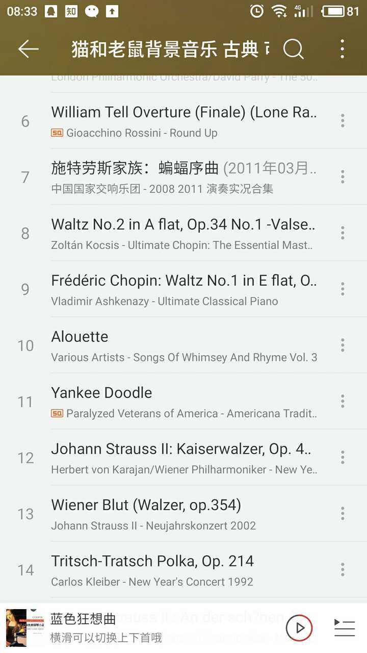 第23集,Springtime for Thomas,出现门德尔松的《春之歌》,Op.62 No.6。 第29集,The Cat Concerto,出现肖邦的《d小调前奏曲》,Op.28 No.24,李斯特的《升c小调第二匈牙利狂想曲》,S.244 No.2。 第63集,The Flying Cat,出现肖邦的《降E大调华丽大圆舞曲》,Op.18。 第75集,Johann Mouse,小约翰·施特劳斯专场。出现的曲目有:《维也纳气质圆舞曲》,Op.354,《蓝色多瑙河圆舞曲》,Op.314,《无穷动波尔卡》,Op.257,《皇帝圆舞曲》,Op.437,《闲聊波尔卡》,Op.214。 第132集,Snowbody Loves Me,肖邦专场。出现的曲目有:《革命练习曲》,Op.10 No.12,《夜曲》,Op.15 No.2,《激流练习曲》,Op.10 No.4,《降A大调辉煌大圆舞曲》,Op.34 No.1,《蝴蝶练习曲》,Op.25 No.9,《降E大调华丽大圆舞曲》,Op.18,《降b小调第二谐谑曲》,Op.31,《幻想即兴曲》,Op.66。 当然最出名的还是蓝色狂想曲《Rhapsody in Blue》 啦,一听见这个bgm就自动脑补Tom满屋子追jerry的画面 [蓝色狂想曲]_George Gershwin在线试听,蓝色狂想曲无损,蓝色狂想曲无损音乐,flac,ape,hifi的无损下载就在酷我音乐 |