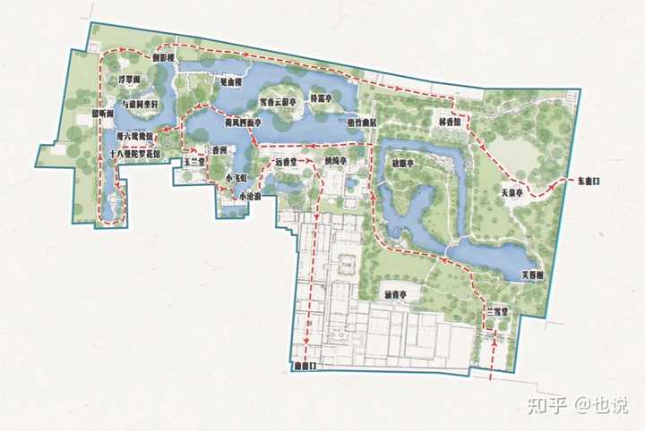 这么大的园子,供一个人玩,还压抑么,狭隘么? 如果没概念,就是124个?标准篮球场的大小。 但是,如今变成了“公园”,格局就不够看了。 所以,我们常见的苏州园林,是这样的。 |