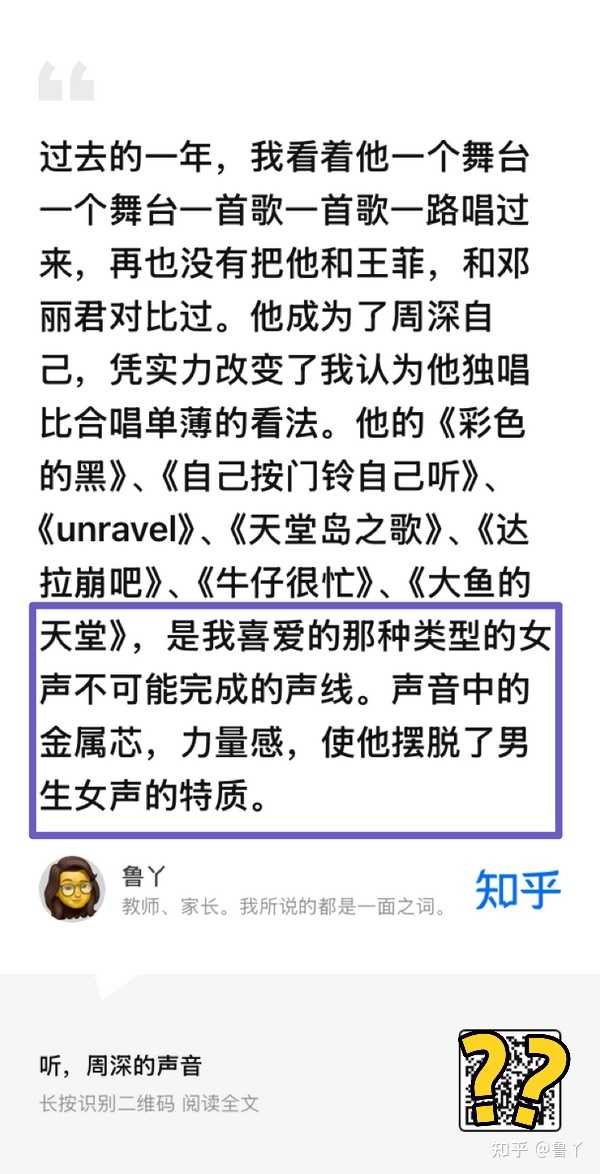 系统把知乎文章识别为第三方给我把图片屏蔽了。不知道何时能解决,我把它处理成正宗图片吧。 这是我的专栏文章《听,周深的声音》,时间是2021年,回顾的是2020年及之前的演唱,随手举了那么几个例子。在这篇文章中,我回顾了周深出道来唱功的精进。所以真要说周深由唱虚到唱实,那也应该是在那个时候就大范围开始了。 爱写字就有这个好处,现在翻出来即可佐证事实。不至于时间来到2025年,就因为几首歌碰巧都是胸声唱法,随口就胡咧咧。 歌手们之间会全方位关注别人的作品吗?肯定不会,至少不能跟歌迷比,特别是当红歌手,哪有时间。对同行的作品基本上只是礼貌性地做个评价,不过是凭随机听到的几耳朵得来的印象。 有这样的印象,是随着他接到的歌儿的类型来的。近年钱雷同学给他写的歌曲类型就有改变。加上其他作者的好作品,他近期的曲库里确实这类歌占比比以前高了。——这是这类作品的数量多了造成的假象,而不是他现在才有了这样的唱法。以他现在的工作量,其他唱法的歌仍然很多,昨晚获得腾讯年度歌手时,不就唱的《聊聊》嘛。 别人不知道,钱雷这里恐怕是蓄意的。? ???? 毋庸置疑他还会精进唱功。所以用“改唱法”来形容他的进步是不合适的。他是个学习型人才,你会发现他一直在进化,所以他音乐的路会越拓越宽,唱法越来越丰富。他根据歌曲需要挑了一种唱法唱歌,不是换了一种唱法唱歌。 送礼物 还没有人送礼物,鼓励一下作者吧 |