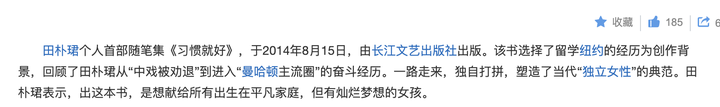 田朴珺还写过一本随笔集,叫做《习惯就好》。 光看这本书简介里的几个关键词,“曼哈顿主流圈”“独自打拼”“灿烂梦想”,就能知道这又是田朴珺宣扬自己是独立女性的伪鸡汤。 |