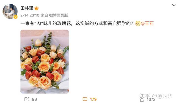 后来,被网友挖出来,这锅红烧肉是王石做给田朴珺吃的。 一个站在名利场的大企业家,被田朴珺称为“笨笨”,的确是“真爱”了。 2023年情人节,田朴珺在微博再提红烧肉。 |