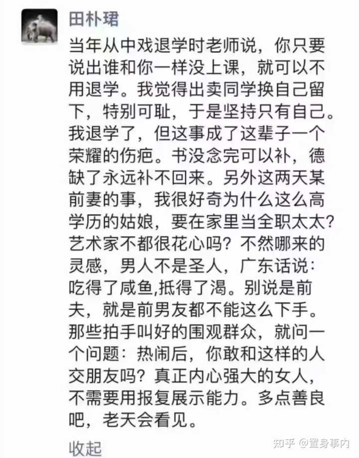 一个是上位成功,一个是被迫离婚,女人何苦为难女人。 01 12月22日,田朴珺在朋友圈,发了一段文字,表达了对李靓蕾爆料王力宏的看法。 田朴珺的意思有以下几点: 1、开篇表明自己不会揭人短、出卖亲友。 2、质疑高学历的李靓蕾为什么要在家当家庭主妇。 3、为“艺术家”的花心行为开脱,称其为找“灵感”。 4、输出自己的是非观:像李靓蕾这种女人,交不到朋友。 |