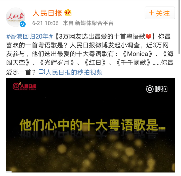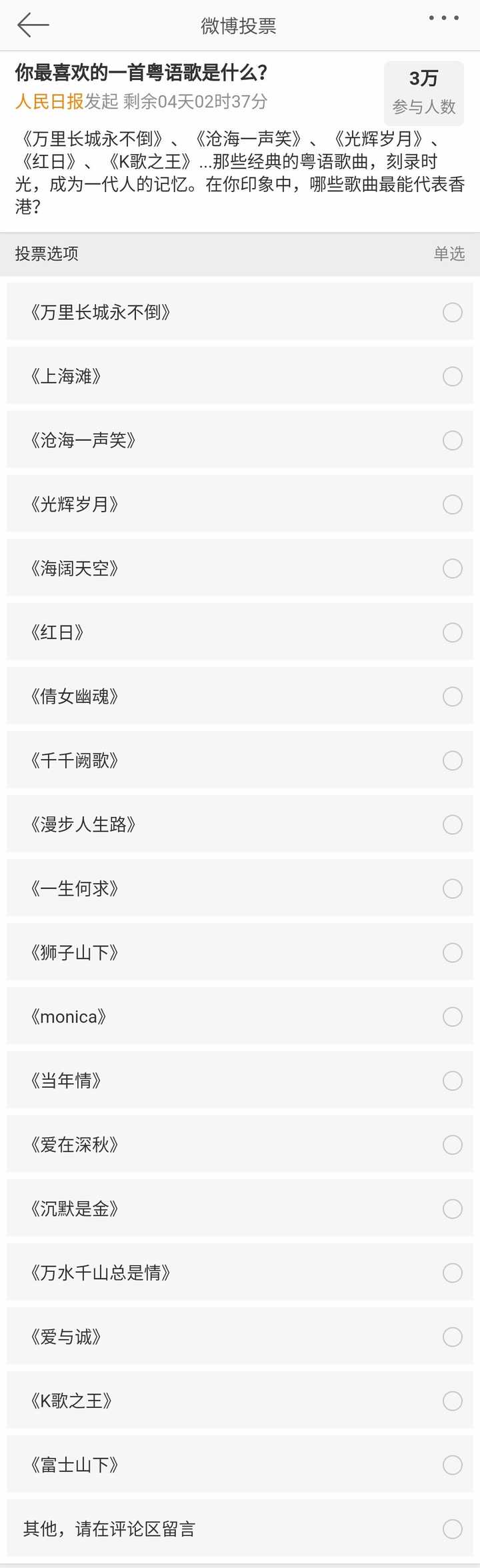 《万里长城永不倒》1982年发行 《上海滩》1980年发行 《沧海一声笑》1990年发行 《光辉岁月》1990年发行 《海阔天空》1993年发行 《红日》1992年发行 《倩女幽魂》1987年发行 《千千阙歌》1989年发行 《漫步人生路》1983年发行 《一生何求》1989年发行 《狮子山下》1996年发行 《Monica》1984年发行 《当年情》1986年发行 《爱在深秋》1984年发行 《沉默是金》1988年发行 《万水千山总是情》1988年发行 《爱与诚》2004年 《k歌之王》2000年发行 《富士山下》2006年发行 现在是2017年,选项里最"年轻"的歌曲也已经11岁了,11年来香港乐坛并不是只有这几首歌。 投票标题写着"你最喜欢的一首粤语歌是什么?",但小字部分又写着"在你的印象中,哪些歌曲最能代表香港?"。在投票结束后制作的视频里,官方甚至放错了《似是故人来》的视频,歌确实是梅艳芳的,但声音真的不是。 而且不好意思哦,我喜欢的广东歌好像不能代表香港,它真的只是一首歌而已,没有要代表的意思。 我们再看看微博正文的hashtag |