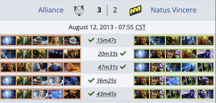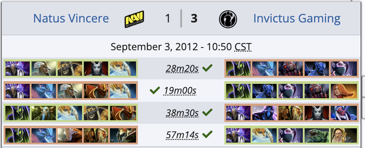 TI4:NewBee vs VG,算是公认非常无聊的一届TI,你看时长都能感觉到。这个时间点确实太早了,职业化和技战术水准都还处于不太高的程度,也缺少即时的应对,导致找到版本答案的NB轻松碾了过去…… |