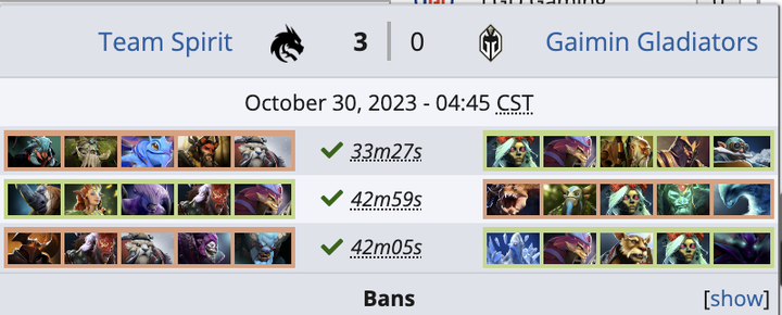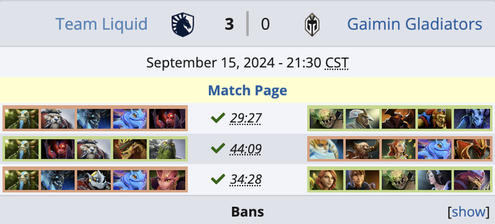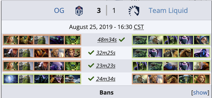 TI13:Liquid vs GG,刚刚结束的比赛,Liquid成功破除心魔,依靠胜者组体力优势打死了状态下滑的GG。GG作为连续多次大赛战胜液体的苦主,其实在打法层面并不虚液体,哪怕状态不佳他们也确实能够给液体造成一定麻烦,但变形之后的操作让三局比赛都比较早就失去了悬念——除了大隐刀龙骑多拖了一会儿。整体节奏很快,也打过一些精彩的拉扯,nisha和33也有很精彩的个人秀,观赏性算是中等。液体“必须要BAN”的强势英雄太多了,导致GG在BP层面盘盘落于下风。同样是超模英雄,别人拿出来比自己更超模,自己不敢不ban,这就真的没法打。全盛期的GG也不一定能战胜这支液体,但至少能逼着液体拿出更多东西。 |