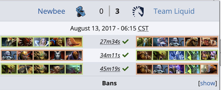 TI7:Liquid vs NewBee,第一个3:0,场面上没有后面那么碾压,只能说临场状态差距还是比较大,NB后期打得比液体差不少。战术层面都比较传统,半决赛MC的先知更好看。和GH三选一、MC大招先知相比,NB武器库显得捉襟见肘,尽管在最后一局一度让人看到一些希望,但最终依然被横扫出局。 |