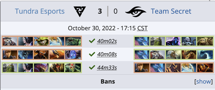 TI11:Tundra vs Secret,说一路碾过去问题不大,这届比赛实际上能看出新时代BP和传统风格BP在比赛当中的差距了,“打中期”成为了相当主流的打法,而11-13三届当中Tundra和Liquid都赢得了冠军,GG也两次获得亚军,而在其他比赛当中西欧队伍的强势也已经显露无疑。在更快节奏、超强执行力面前,中期防守反击难度越来越大。这一届不好看的主要原因是道具平衡性很差,双方战术层面的博弈也相对单调,secret始终没能找到破局点——或者说根本没办法突破33这堵高墙。 |