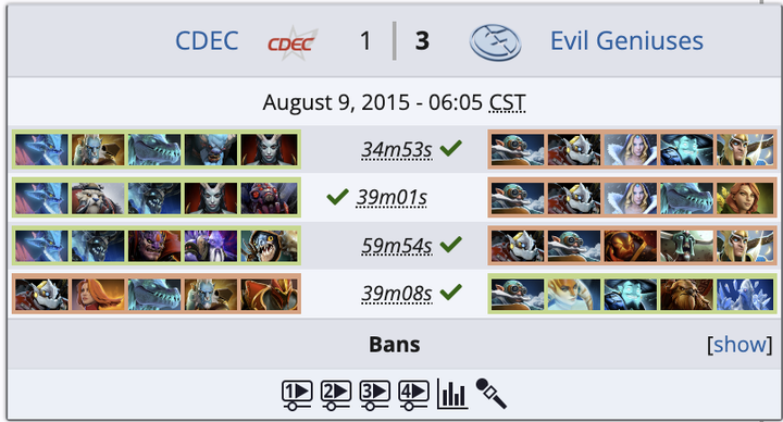 TI5:EG vs CDEC,Sumail的个人秀,BP劣势和老鹿熟练度不佳导致局面一直比较被动,中间想了很多办法但最终还是败下阵来。BP相对比较单调。这一届平衡性不算好,走到最后队伍还做不到破局(破解aui2000那两手绝活4),所以最后阵容和打法也相对单调。 |
