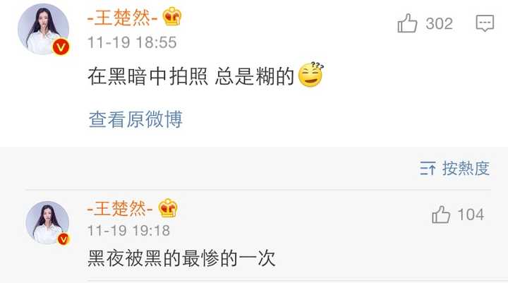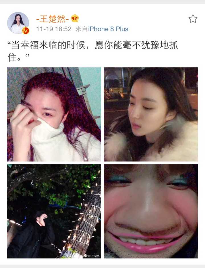 第五 她很低调 微博经常不更新 都要长草了 没事就是和朋友出去玩玩玩吃吃吃~当然是除了拍戏之外的时间~粉丝每天都只能靠各种看美图来想她(掩面)而且每次自拍都是高糊!好生气!看看看看!好不容易发个微博都是高糊(无语望天) |
