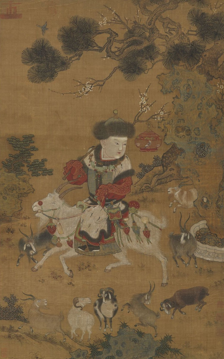 元人 戏婴图 轴 台北故宫博物院藏 元代以来,“绵羊引子”图样日臻成熟,明清两代盛极一时,有强烈鲜明的冬至吉祥意义。 冬至又称阳生,常用羊、羊吐气的图案代表此意。因此明清时期,羊作为一种重要的纹样题材开始应用在冬至服饰之上。“太子绵羊”图案是由阳生纹进一步衍化而来,又称“绵阳引子”。图中太子头戴胡帽,肩扛梅枝雀笼,骑于羊背之上或驱赶群羊,即为“九阳消寒图”。 图中太子身骑大羊,肩挑挂一鸟笼的梅枝。笼中喜鹊挂于梅枝之上,寓意“喜上眉梢”,戎装太子寓意“荣华富贵”,绵羊之“羊”通“祥”, 寓意“吉祥如意”。 |