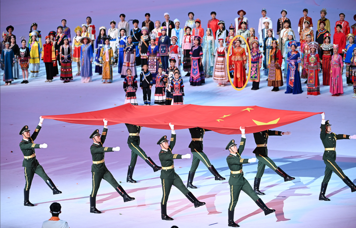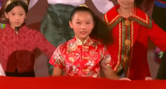 2023年成都大运会开幕式,56个民族的青年代表大合唱,汉族女子穿秀禾服 |