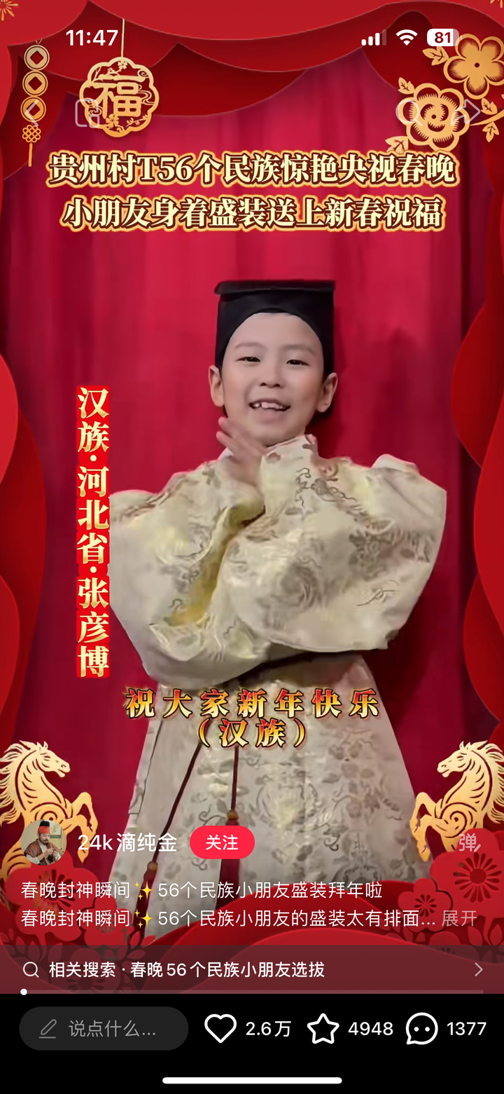 今年2026年春晚《吉量》,汉族代表服装彩排时还是马甲,后来终于改了,换成汉服,汉族小朋友气质也更好了 |