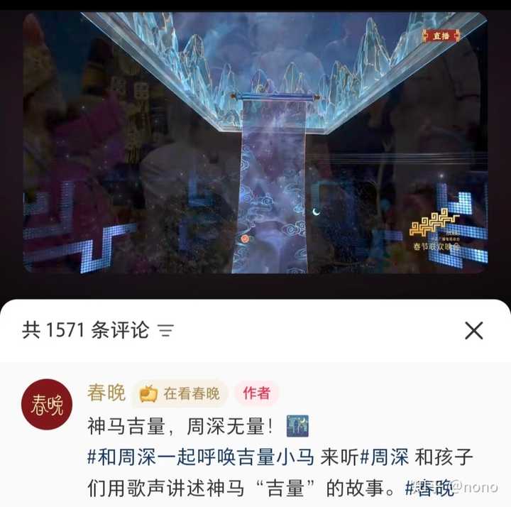节目播出第五天了,写点心路历程: 三十晚上看直播,当时只感觉这个节目特别短,连周深的样子都没看清楚就结束了,有点意犹未尽,独唱节目的歌手怎么就只有一点点特写镜头?他穿着一套水墨画绣金线的白色礼服,干净又贵气,帅得不得了,我更是心慌慌,连歌也没怎么听明白(后来还看到了另一种竖屏版的,镜头多一点,还有版饭拍,周深唱歌的时候其实是有设计动作的,很帅的动作),后面接着演了什么节目也没心思关注,好象有小品,听见家人在笑。 |