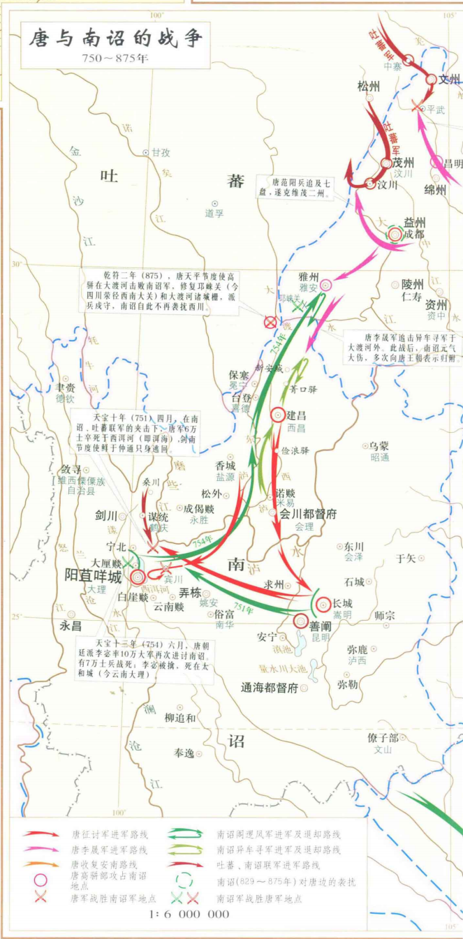 对西北的战争暂告一段落,高骈开启了南征南诏的征程。话说在云南的洱海地区,存在六个小国,被称为“六诏”。位于“六诏”最南方的一个小国为蒙舍诏,也被称为“南诏”。为应对日益强盛的吐蕃,唐政府有意扶持南诏坐大对抗吐蕃,形成一个强有力的牵制。唐玄宗开元年间,蒙舍诏皮逻阁兼并其余五诏,统一整个洱海地区,并在次年徙居大和城(今云南大理)。 【南诏,或曰鹤拓,曰龙尾,曰苴咩,曰阳剑,本哀牢夷后,乌蛮别种也。夷语王为“诏”。其先渠帅有六,自号“六诏”,曰蒙秀诏、越析诏、浪穹诏、邆睒诏、施浪诏、蒙舍诏。.....开元末,皮逻阁逐河蛮,取大和城,又袭大厘城守之,因城龙口,夷语山陂陀为“和”,故谓“大和”,以处阁罗凤。天子诏赐皮逻阁名归义。】《新唐书·卷二百二十二上·列传第一百四十七上》 玄宗也对此进行了追认,最初,唐与南诏的国际关系还算和谐,南诏也配合唐廷在西南方向牵制吐蕃。但随着南诏国日益强大,加之唐廷一系列举措失当,双方矛盾日益增加: 鲜于仲通领剑南节度使期间爆发的“张虔陀事件” 【鲜于仲通领剑南节度使,卞忿少方略。故事,南诏尝与妻子谒都督,过云南,太守张虔陀私之,多所求丐,阁罗凤不应。虔陀数诟靳之,阴表其罪。由是忿怨,反,发兵攻虔陀,杀之,取姚州及小夷州凡三十二。】《新唐书·卷二百二十二上·列传第一百四十七上》 此事之后,南诏王阁罗凤发兵攻陷唐廷所置姚州都督府“取姚州及小夷州凡三十二。”唐与南诏就此爆发全面战争。起初,在鲜于仲通和杨国忠的“英明”领导下,唐军大败,死伤惨重。 直至唐代宗大历年间,阁罗凤死后,情况才有所好转。德宗一朝,在军事上取得了一些小规模的胜利,但也仅限于此了。 所以在贞元年间(公元785年-805年),在这个时间段内,经过西川节度使韦皋的一系列努力下,双方达成和议。谁也奈何不了谁,可不就是只能议和了么?然而这一缓和的关系并不稳固,新国王劝利晟继位后,经过一番经营,国力日益兴盛,再起扩张之心。唐穆宗长庆二年(公元822年),南诏再次大举进犯唐廷边境。唐武宗会昌六年(公元846年)“云南蛮寇安南”,西南边境烽火不断。等到了世隆(这名字同时犯唐太宗李世民和唐玄宗李隆基的讳,但我这里还是用这个名字)继位,唐懿宗咸通四年(公元863年)南诏连安南都护府也攻陷了。 【是日,南诏陷交趾,蔡袭左右皆尽,徒步力战,身集十矢,欲趣监军船,船已离岸,遂溺海死;幕僚樊绰携其印浮渡江。荆南、江西、鄂岳、襄州将士四百馀人,走至城东水际,荆南虞候元惟德等谓众曰:“吾辈无船,入水则死,不若还向城与蛮斗,人以一身易二蛮,亦为有利。”遂还向城,入东罗门;蛮不为备,惟德等纵兵杀蛮二千馀人,逮夜,蛮将杨思缙始自子城出救之,惟德等皆死。南诏两陷交趾,所杀虏且十五万人。留兵二万,使思缙据交趾城,溪洞夷、獠无远近皆降之。诏诸道兵赴安南者悉召还,分保岭南西道。】《资治通鉴·卷第二百五十·唐纪六十六》 此时的南诏,版图已经达到了巅峰。而就是这样一个强国,即将迎来他们的噩梦:高骈。 但高骈并不是第一波被派出去的,在此之前,朝廷先后任命康承训(后平定庞勋之乱)和张茵为岭南西道节度使前往征讨南诏,但这二人在此期间表现的非常差劲,故唐懿宗决定易帅再战。 【岭南东道节度使韦宙具知康承训所为,以书白宰相;承训亦自疑惧,累表辞疾,乃以承训为右武卫大将军、分司,以容管经略使张茵为岭南西道节度使,复以容管四州别为经略使。时南诏知邕州空竭,不复入寇,茵久之不敢进军取安南。】《资治通鉴·第二百五十·唐纪六十六》 最终在宰相夏侯孜的举荐下“咸通中,帝将复安南,拜骈为都护,召还京师,见灵台殿。于是容管经略使张茵不讨贼,更以茵兵授骈。” 唐廷最终将希望寄托在高骈身上,还将张茵的兵马授予他。咸通六年(公元865年)春,高骈率五千兵马进抵海门(今广西北海),趁南诏军在收割稻谷充军粮之时,挥军击之,大破敌军,还将其收割的稻谷作为己方的军粮,这波因粮于敌也使后勤得到保障。 【高骈治兵于海门,未进;监军李维周恶骈,欲去之,屡趣骈使进军。骈以五千人先济,约维周发兵应援;骈既行,维周拥馀众,不发一卒以继之。九月,骈至南定,峰州蛮众近五万,方获田,骈掩击,大破之,收其所获以食军。】《资治通鉴·第二百五十·唐纪六十六》 此战,在监军不肯发兵支援的情况下,高骈以五千破五万,可谓神乎其技。 至次年四月,南诏派三将带兵支援前线,唐廷也益兵高骈,得到支援的高骈再次率兵,屡战大破贼军,沉重打击了南诏军的有生力量。 【七年六月,骈次交州,战数胜,士酣斗,斩其将张诠。李溠龙举众万人降,拔波风三壁。】《新唐书·卷二百二十二中·列传第一百四十七中》 【南诏酋龙遣善阐节度使杨缉思助安南节度使段酋迁守交趾,以范昵些为安南都统,赵诺眉为扶邪都统。监陈敕使韦仲宰将七千人至峰州,高骈得以益其军,进击南诏,屡破之。】《资治通鉴·第二百五十·唐纪六十六》 之后,高骈向南诏发起总攻,唐军在他的指挥下,大破南诏军,斩首三万,一举收复安南都护府。 【缉思出战,败,还走城。士乘之,超堞入,斩酋迁、脆些、诺眉,上首三万级,安南平。】《新唐书·卷二百二十二中·列传第一百四十七中》 战后,唐廷在安南重置了军事体系“置静海军于安南,以高骈为节度使。” |