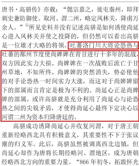 高骈凭借战功,受到唐懿宗的嘉奖,于咸通元年(公元860年)移镇秦州(陇右道),专任刺史一职,兼任经略使,对抗吐蕃。在这期间,高骈同样表现出色,运筹帷幄,诱降吐蕃大将尚延心,并收复河州(今甘肃临夏)和渭州(今甘肃陇西东南)。 【秦州刺史高骈诱降延心及浑末部万帐,遂收二州,拜延心武卫将军。骈收凤林关,以延心为河、渭等州都游弈使。】《新唐书·卷二百一十六下·列传第一百四十一下》 史书中没有记载高骈是用了什么计谋诱降的吐蕃大将,但是根据学者分析,很有可能与唐武宗会昌三年(公元843年)时期,吐蕃大将论恐热与鄯州节度使尚婢婢之间长达多年的战事有所关联。 |