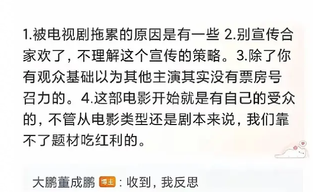 这部《荔枝》正式上映前,就一路点映,抢占黄金场,铺天盖地营销,结果还不是无济于事? 正式上映的首日票房,和早已暴雷的《罗小黑2》,打个了卧龙凤雏,3500万收关。 要知道,这部《荔枝》是25年暑期档,营销宣发力度最大的一部电影, 出品方11个,联合出品方23个,猫眼平台从制作出品,到发行,到宣传营销三个环节,全面包办, 这完全是比照一部春节档5亿成本大片的营销力度, 再看看刘德华/杨幂/张若昀/常远/孙阳/林雪/魏翔/王迅/宋小宝……这样的“全明星助演阵容”,恨不得一个半分钟出场的龙套角色,也必须得是娱乐圈有名有姓的明星。 可以说,稍微懂行的人就知道,这种规模的主演阵容和营销力度,总成本没有至少5个亿根本打不住。 这片子就是奔着独霸今年暑期档来的,对标的其实是前年乌尔善的《封神1》(26亿票房),,去年沈腾/马丽的《抓娃娃》(32亿票房), 属于各方资本全程保驾护航的【预制爆款项目】。 20多家参投娱乐资本的预期目标,可绝不仅仅是15亿票房,能收支盈余不亏本, 没有至少20亿票房,大鹏他都根本没法向这么多投资方交代。 结果呢?第一天上映,和《罗小黑2》杀得难解难分?3500万?这票房就直接判死缓了,足以让所有投资方心都直接凉了大半截。 最终盖棺落定的7亿票房意味着什么?意味着已经不是赚多赚少的问题了, 大鹏过去10年积累的圈内人脉,甚至个人财富,都得倒赔回去一大半! 虽然电影市场,默认「总票房超过3倍投资成本,即可盈余不亏本」的普遍认知。 但是呢,从参投资本的角度,可绝不会仅仅满足于“不亏本”,而从来都是只要赚得没预期值多,出品方就会觉得自己是赔了大本。 就以大鹏自己为例,他十年前第一部电影《煎饼侠》,投资成本不会超过2000万,加宣发总成本,不超过5000万,就拿下11.6亿票房,也是他迄今为止的最高票房成绩, 当时他是何等风光无限,各方资本热捧的宠儿,在综艺节目里都动辄以“十亿票房导演”自居, 但是,这部《煎饼侠》的本质,是一众客串明星,都是冲着当时还正兴旺的搜狐平台去的,大鹏一个新人,哪有那样的脸面?他最后连主演加导演酬劳,最多也就赚了几百万, 2017,大鹏第二部电影《缝纫机乐队》,投资8000万,票房4.56亿,片方分账1.62亿多,净赚了100%的成本;可是就因为盈利额远不如《煎饼侠》, 因此不管是各家投资方,还是大鹏本人的反应,就和亏了大本没区别。 所以那之后的大鹏,直接被“打回原型”,咖位一落千丈。 要么在《21克拉》《第十一回》《无名》里演配角, 要么主演的也是《受益人》《铤而走险》《第八个嫌疑人》这种小成本电影,甚至还有一部《大赢家》,都没上院线,直接改成网络大电影了。 这几年时间,但凡提起大鹏,根本没人把他当回事,昙花一现的电影圈二线小咖而已。 之后的大鹏,又是怎么东山再起的?一方面是努力演戏,主配不挑,混剧组攒人脉, 更关键的是,他一个靠《屌丝男士》成名,甚至邀请日本成人女优(波多野XX,吉泽XX)一起做节目,搞暧昧,起家全靠了“底层宅男基本盘”的草根明星,——居然选择了投靠在娱乐圈(juan)势力巨大的【女拳】! 《保你平安》,2023年3月上映。 女主角李雪琴张嘴就是“女拳金句”:「当你张嘴说一个女人是小姐的时候,不管她是不是,她都已经是了」。 冷笑,我们看到的现实明明是:「当女拳张嘴说一个男人是色狼的时候,不管他是不是,他都已经是了」 就在该片上映之前,已经爆发了主持人朱军案,网络作家张恒案,歌手霍尊案,货拉拉跳车案,阿里周某案,清华学姐案…… 一个个男性公民被无端诬蔑为“色狼”“渣男”“性骚扰”“强奸犯”,迅速成为网络热点新闻,女拳之恶罄竹难书! 而且,这个著名女拳师李雪琴,早在2022年7月底,在真人秀《五十公里桃花坞》,公开扬言:「对男人心软 就是对自己心狠」「姐妹们记住 心疼男人倒霉一辈子」。 大鹏却找李雪琴拍戏,让她头一回当电影的女主演,把这个高考作弊的著名女拳师,(自称根本不会游泳、却为了高考加分,搞出一张二级游泳证)捧进电影圈,则此人对“女拳”的态度,可想而知! 甚至可以说,《保你平安》就是靠“屌丝男士”起家的大鹏,改弦更张变换立场,向女拳势力的投名状! 而他这部自导自演电影,在【女拳】势力的帮忙大力营销下,在一众根本不知道大鹏“前科”的小仙女们的追捧下, 这部投资总成本,大约1.5亿的电影,拿到7.2亿票房,净赚了1个亿。 于是呢,各方娱乐资本,当然又觉得大鹏有前途了。 之后的大鹏,导演的《热烈》,靠着粉丝团购买力惊人,什么烂片都能「自带5亿票房资本盘」的超级顶流明星王一博,以及黄渤等知名大咖的助阵,拿到9亿票房。 然而这部电影的投资成本和宣发成本,加起来不下3个亿,也就是说,所有投资方根本都没赚,浪费近一年时间,白打工一场。 到了年底,他主演的《年会不能停》,小成本黑马电影,近13亿票房,首功明明是董润年这个导演兼编剧。 大鹏既不是导演和编剧,也不是监制,甚至他的公司也不是正式的8家出品方之一,只是把他个人片酬折算为投资,挤进了12家联合出品方之一, 虽然他是第一主演,但在这部电影的作用,也就是完成了演员的本职工作。 但是呢,在那之后,因为导演兼编剧董润年,十分低调, 在大鹏的刻意营销造势下,实在有太多人都把《年会》也当成了大鹏主导的电影。 而《长安的荔枝》的三主演,直接照搬《年会》的主演团,更是潜移默化地加深