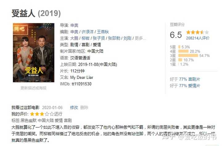 《大宅男》 所以,不要怀疑,他一直混迹在电影圈,无论是有台词无台词,配角主角,他都存在过。 当然,他参演了那么多的电影与电视剧,都只是收获了“名字”。 你说他上升势头好,可能是2015年执导了《煎饼侠》获得了票房和关注,可很快,就在2017年执导《缝纫机乐队》的时候被大家骂贩卖情怀了。 加上大鹏早些年的一些行为被大家不待见,还在主持《演员请就位》第二季受到了质疑。 犹记得他开始有转型的感觉,是捆绑柳岩一起参演2019年的电影《受益人》。 当时我对他在这部电影的印象,正如我评价电影《受益人》的时候说的:“大鹏就算化了一个如此不堪入目的妆容,都改变不了他内心那种傲气和不羁,所谓的底层失败者,其实更像是一种对于底层的嘲笑。” |