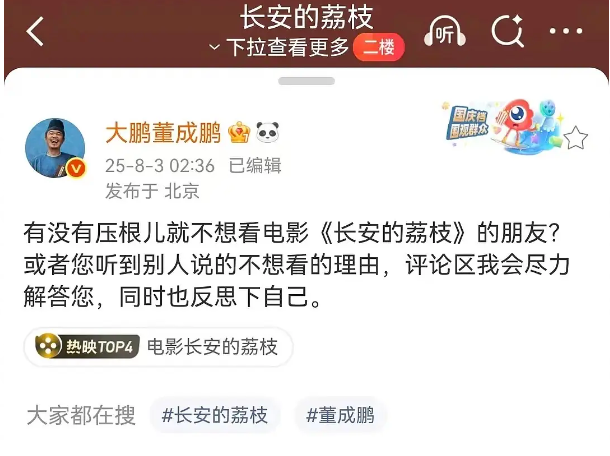 哈哈,半个月来,一直尬吹大鹏的那些朋友,看看铁一般事实了么? 随着《南京照相馆》大爆,《浪浪山小妖怪》也大有黑马之姿, 上映18天,票房勉强够6亿,下线时最多7个亿的《长安的荔枝》, 被一片尬吹为今年第二好电影、春节档后最好电影的《长安的荔枝》, 成了暑期档亏得最惨的电影之一。 大鹏已经扑街到破防,到公开发博,宣布“反思”了。 |