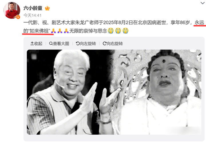 现如今朱广龙先生离世后,曾与其一起在86版《西游记》中出演过孙悟空的六小龄童,也发文哀悼称其是:永远的“如来佛祖”。 |