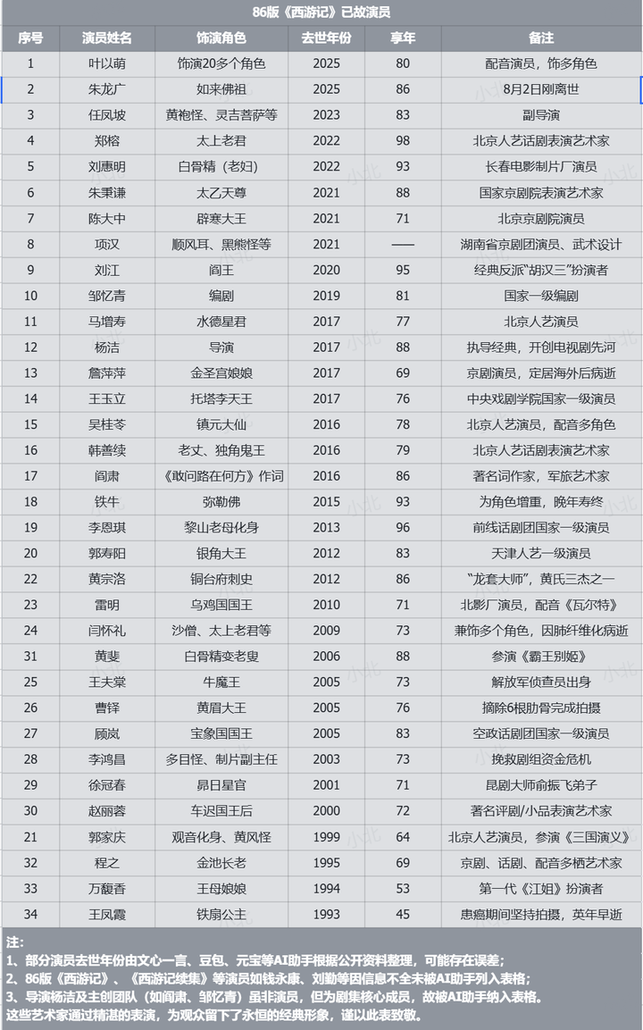 其实,在86版《西游记》播出的39年里,因病离世或是寿终正寝的演员就已经多达33位。 |