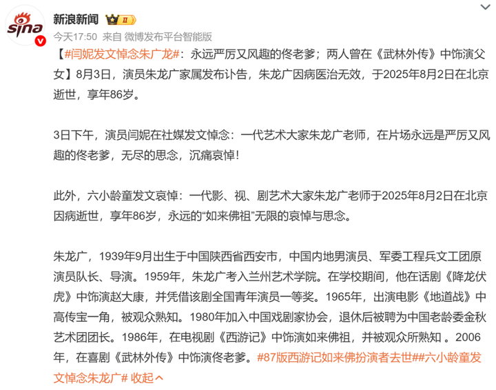 8月3日,演员朱龙广家属发布讣告,演员朱龙广因病医治无效,于2025年8月2日在北京逝世,享年86岁。据悉,朱龙广曾塑造《地道战》高传宝、87版《西游… |