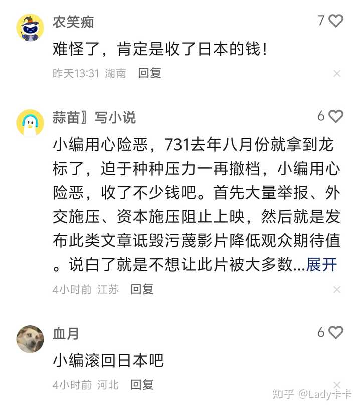 还记得749局吗??? 电影要上映的时候 各种营销,给人一种神秘但真实,恐怖又猎奇的感觉。 当时推迟上映的原因 也是越传越离谱 什么档案解禁啊,什么外国间谍啊。。。 反正理由就各种离谱且腹黑。 关键是我老婆真信了啊。 上映就拉着我去看。。。。 看完结果发现就是一坨 真的。。。非常非常烂。。。 现在这个所谓的731,不知道是不是想借着爱国的名头来捞钱的。 |