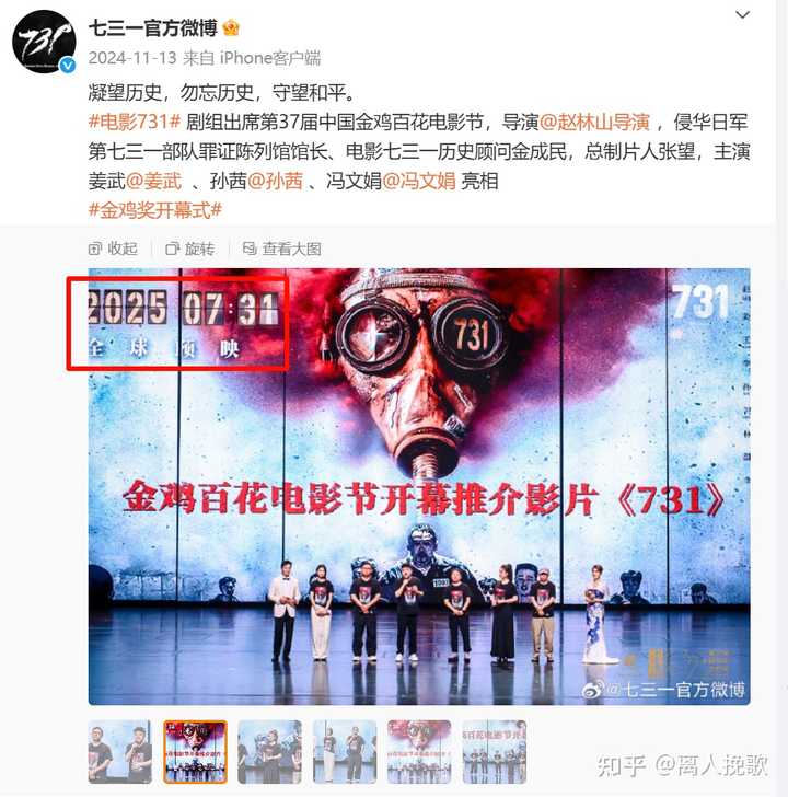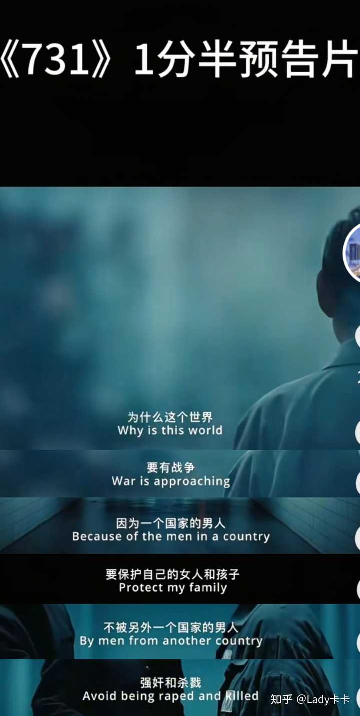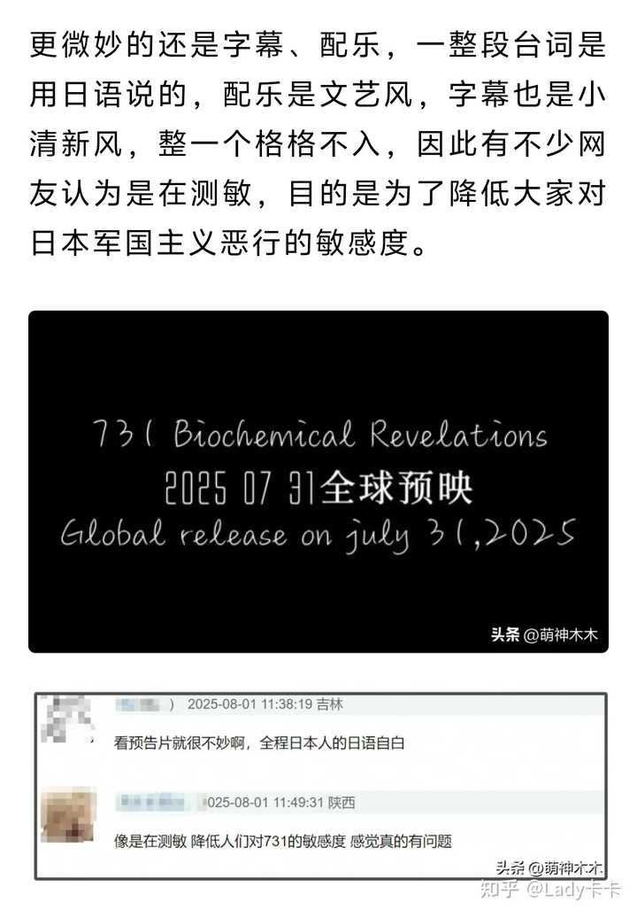 2. 赵林山在发布会上表示,该电影不拉民族仇恨,以主讲人性关怀为主要观影诉求,通过人性自我救赎的呈现,增强时代观影人群的“强国情绪”。有别于其他刻画战争的影片,该电影旨在借还原史实,传递反战主题,呼吁尊重生命,热爱和平 。 注意这里的“人性自我救赎的呈现”,联想“731”这种题材,还要刻画人性自我救赎。深度思考一下,电影里的主要角色实际上就两种:被当试验品的中国人、731部队里的日本人。那么,导演会如何安排这段“人性自我救赎”呢?是不是又是“日本人也有人性”的老叙事呢?这种在红线上下来回横跳的叙事的电影在以往还真有可能过审,但是今年刚好赶上反法西斯胜利80周年,红线稍微紧一紧就很难过审。 3.宣传片 |