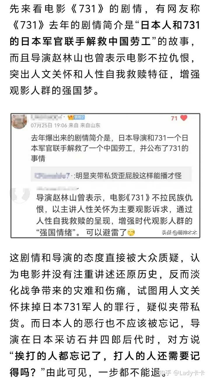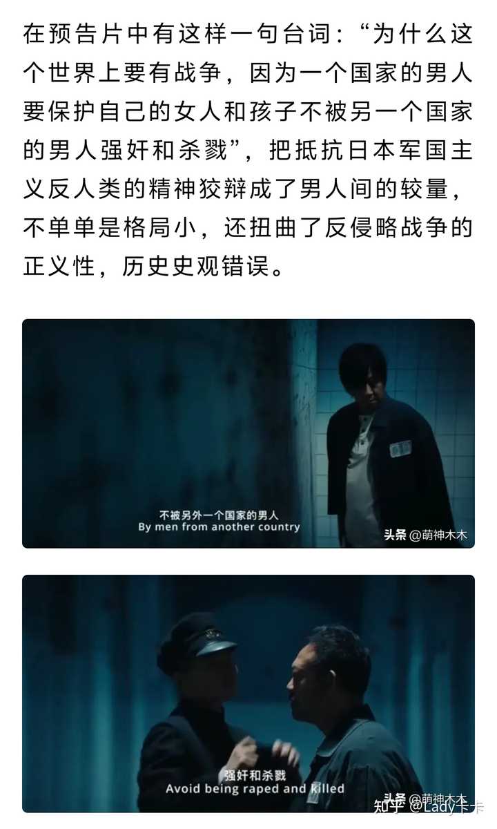 4.编剧刘恒,代表作《集结号》、《金陵十三钗》。 编剧也早就被锤立场不正。 以《集结号》为例,团长为了大部队撤退而未下达集结号,导致九连几乎全员牺牲。这种做法被批评为与解放军的传统不符,因为真实的解放军战士在阻击战中通常会被告知做好牺牲准备,而不会采用欺骗的方式,这里有丑化解放军的嫌疑。 《金陵十三钗》,直接引用吧。 杨宁教授等批评者认为,影片设置西方白男人(贝尔饰演的入殓师)拯救中国女人的角色,而真正的中国男人形象在片中无足轻重,是“谄媚西方”以冲击奥斯卡,甚至被斥为“汉奸电影”。此外,外媒也批评其将性元素作为核心噱头,戏剧化处理妓女与学生的命运绑定,未能真实还原南京大屠杀的真实性。 以上仅是我结合自己的了解做出的推论,还是以电影上映后的评价为准。 我个人情感方面非常希望导演能够尊重历史、还原历史,不要掺杂私货和一些自以为是的个人想法的拍一部属于大陆的、能与《黑太阳731》相提并论的作品。 这是在今日头条上看到的,看来有人是和我持差不多的观点。 引用截图来自 @萌神木木 的文章。 |