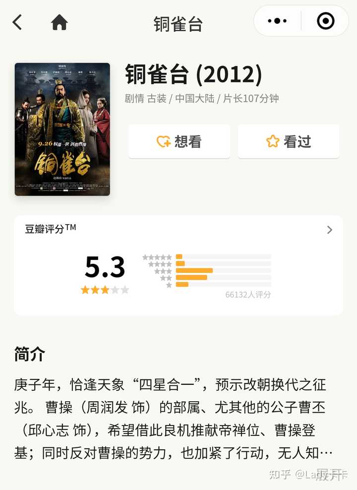 先说我的观点:这部电影很有可能烂到没过审。 以下是我的论点: 1.导演赵林山的作品有《铜雀台》(5.3分)、《我的前任是极品》(豆瓣直接查不到分,也有网站给出5.7分)。可见,导演属于烂片导演,没有超过6分的作品。 |