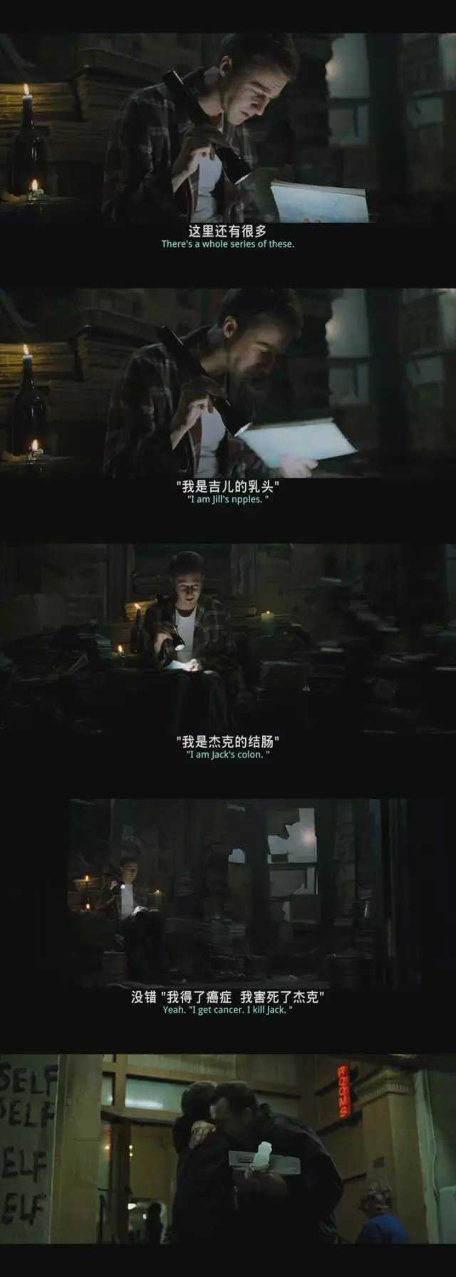 WTF!b早在一开始的时候就在那里了,也就是说诡异一直都在,只不过他此时像幽灵一样不被a觉察而已。 那为什么是你遇见我而不是我遇见你?也许是我想多了,a作为人格的主体,他一直在面临选择,从房爆后在电话亭里纠结打b还是打c的电话开始,他是纠结的优柔寡断的,所以b和c挺身而出帮他选择,a接的两个关键电话,要么是b打的,要么是c打的,就是这两个电话他们三个缠在了一起无法分离。 所有违和感的答案其实就在这里,他们是本我超我和自我的关系,是一体的三种人格。 你以为这里就解释了一切,都完了吗?nonono,不要小看大卫芬奇恶作剧的天赋,他可不满足于凤头豹尾,他要的不是猪肚,而是龙身。 这里有一个隐藏的大boss不知道你发现没?影片一开始他就在那里哦,也是唯一一个让a在他怀里哭泣的男人(这画风好像有点不对哦~=_,=),这个人就是Bob(d)。d才应该是全片当中最不应该被忽略的人,大卫芬奇刻意减弱他的存在感,简直就是幻影第六人般的存在,想象一下如果现实生活中身边有这么一个顶着让所有女人羞愧的双峰而且还特么是个高大魁梧的汉子,你的眼睛不是被亮瞎就是被亮瞎还是被亮瞎。 |