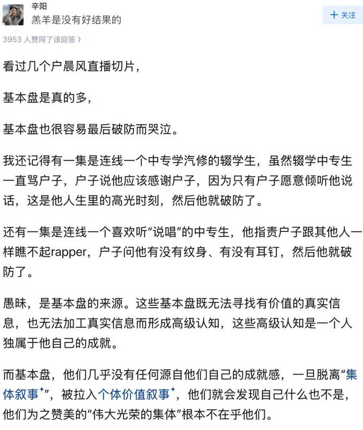 看了知乎评论区我才发现,原来真有人认为他是为民请命啊 。你哪怕去吹杨和平,都不该去吹户晨风吧,直接把人分成三六九等 |