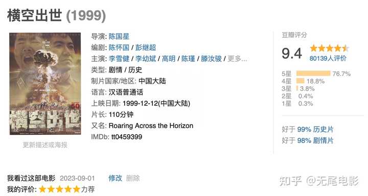 难以想象日后她会成为ETO的统帅。 李雪健老师就不用说了,演什么像什么,这个状态一直维持到现在,太厉害了。 你如果熟悉历史便能看出,电影里陆光达对应的原型,就是“两弹一星”的功勋,邓稼先。 这部电影,可以说是没有技巧,全是感情。它所做的,只是质朴地还原那一段历史。 不用刻意煽情,我们就已经被角色的爱国情怀所打动。 那股人定胜天、不屈不饶的精神,时隔多年后还是如此地让人热泪盈眶。 在那个一穷二白的年代,就真就这样的一群人,完全牺牲个人享乐,全心全意为国家事业奉献自己的一切。 横空出世,说的是原子弹,同样也指的是我们的新中国。 随着这一声巨响,中国人民真正的在世界挺直腰杆。 在电影里提到,伞永远掌握在高个子手里。 而在现实中,真理永远掌握在射程范围里。 《横空出世》目前的豆瓣评分9.4。 |