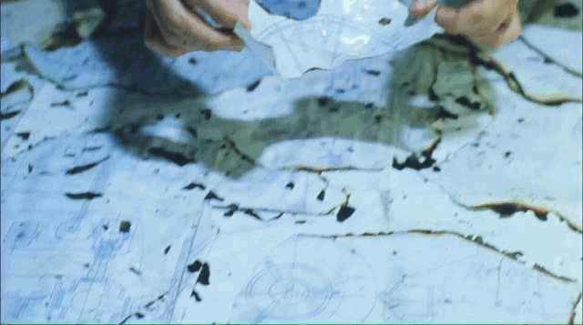 等他们走后,老李上前把没有烧完的图纸捞出来。 他拿回去试图拼凑出完整的设计稿。 |