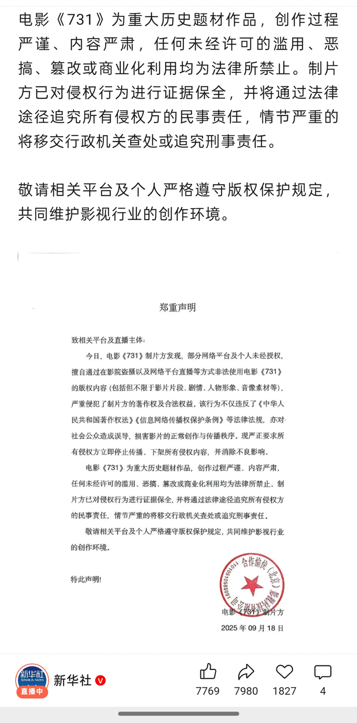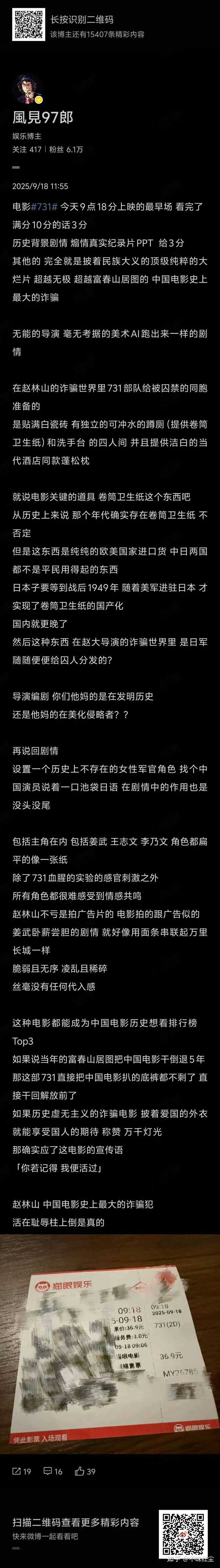 2025年9月18日17:06。 今天晚上我有三个朋友去看《731》。 我倒要看看有没有网上说的那么扯淡! |