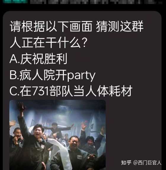 傻逼电影,别看。 剧本逻辑和故事性甚至不如剧本杀,甚至可以说这个破电影就是一个《731》为背景的大逃杀风格剧本杀,用电影手法记录下来了。 上午破纪录,下午大破防。 我是麻薯,关注麻薯,不当韭菜不挨割。 我他妈被割韭菜了,割的还是爱国情怀韭菜,艹(一种植物)。 为了避免各种导演魔幻主义的表现手法等等技术角度的争执,比如这个意思《749》的《731》片段 |