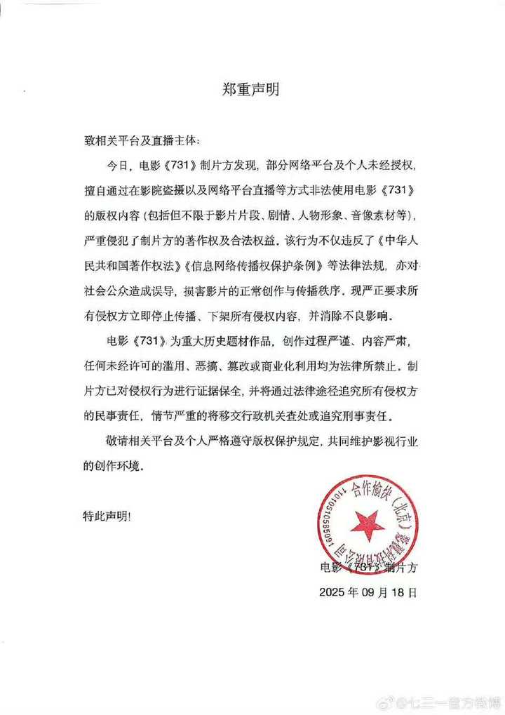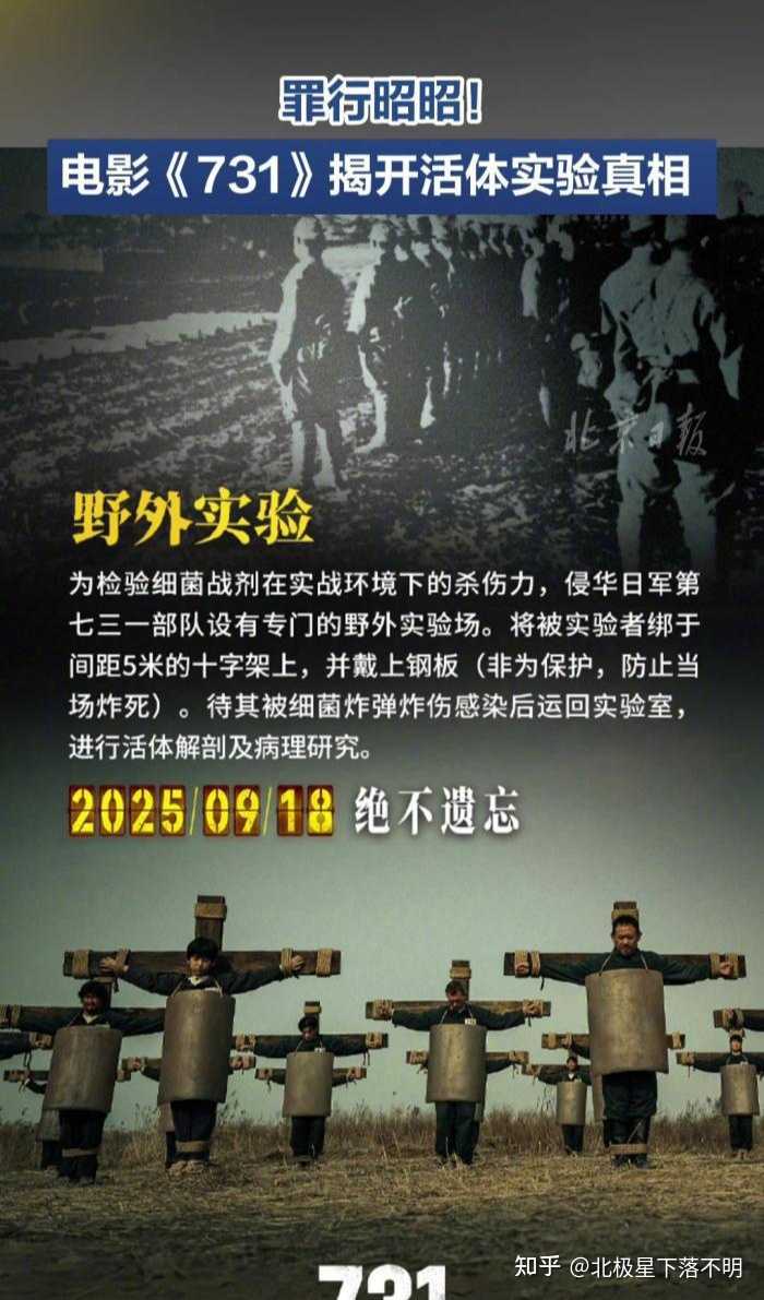 首先声明,我没看。 对于这种题材的影片,我总是抱有敬而远之的态度,一方面长期以来,我觉得把这种题材拍成商业片的,很多就是恰烂钱,另一方面,要是拍的好了,看这这电影有些费眼睛。 《731》上映前两天,我问一个在影院做店长的朋友,《731》的排片咋样,他说特别多,好多单位包场,我说那18号那天的票,给我预留几张,我带人去看,结果有事没去成。 就在写这个回答前半个小时,和这个朋友打了语音,问他周末哪天上班,准备去看《731》,顺便问他的评价,他说作为商业片,拍的跟密室逃脱一样,确实对不起观众。 我说怪不得这两天网上很多人对于这个片子的评价不好,我还以为是有人恶意抨击,听你这么一说,看来确实不咋样。 记得上映第一天,抖音刷到有人在评论区问“好看不好看”,然后引来不少回怼,说这样的影片怎么能用“好看不好看”来形容,这是对当时遇难同胞的不敬。 就手点开这些评论的头像,不出所料,大多都是私密账号。《731》沉重的是题材、是电影内容所讲述的那段历史,并不是电影本身。作用商业片,既然选择了卖票收钱,就不要想着又当又立,观众又不是傻子。 |