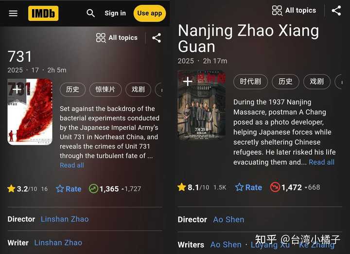 IMDb的评分已经出来了,3.2分,而《南京照相馆》是8.1,简直是笑死我了。 |