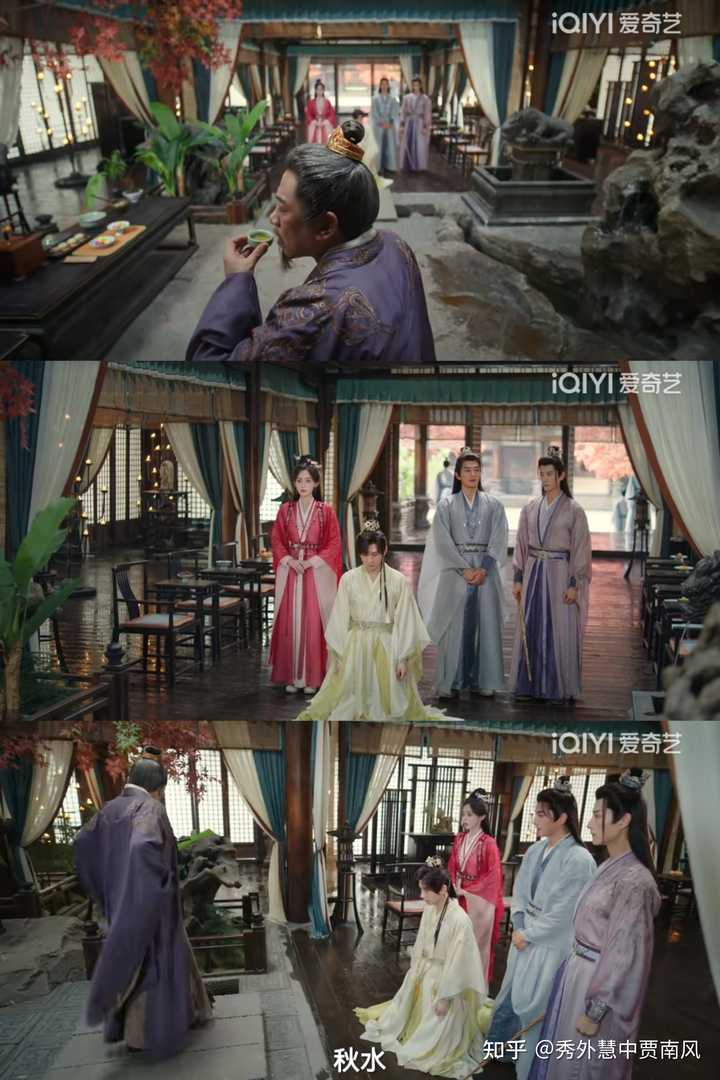提一个常见的问题,当下古装剧的通病,走位。 现在我们看的古装剧,基本上就不讲究走位,主打一个站桩说台词,或者坐着对完词。 像萧秋水回家被父亲训斥,两个哥哥补刀,姐姐打圆场这场戏,从一开始的人物站位看,就知道现场导演没有用心。 那么接下来几个人一动不动把台词对完,几乎没有正常走位戏份,就是意料之中的事情了。 |