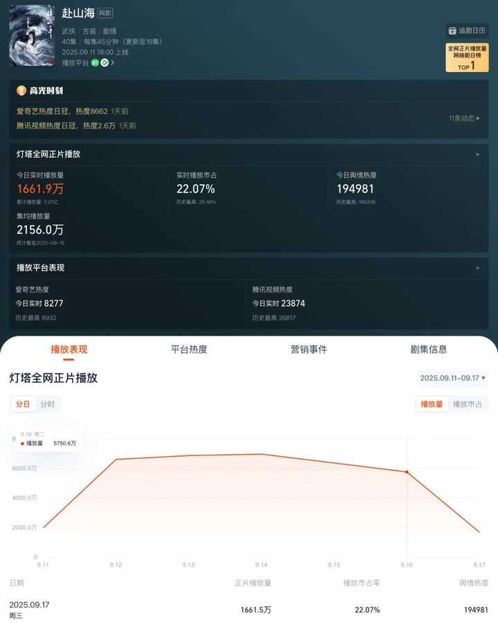 尽管总有剧粉在后台,建议我多看几集再评论。 看完第一集,我就觉得像吃了坏苹果,继续吃,我只会吃更多坏苹果。 灯塔数据显示,《赴山海》已经陷入高开低走的困境。 剧集在上周末达到峰值,播放量6958万。 |