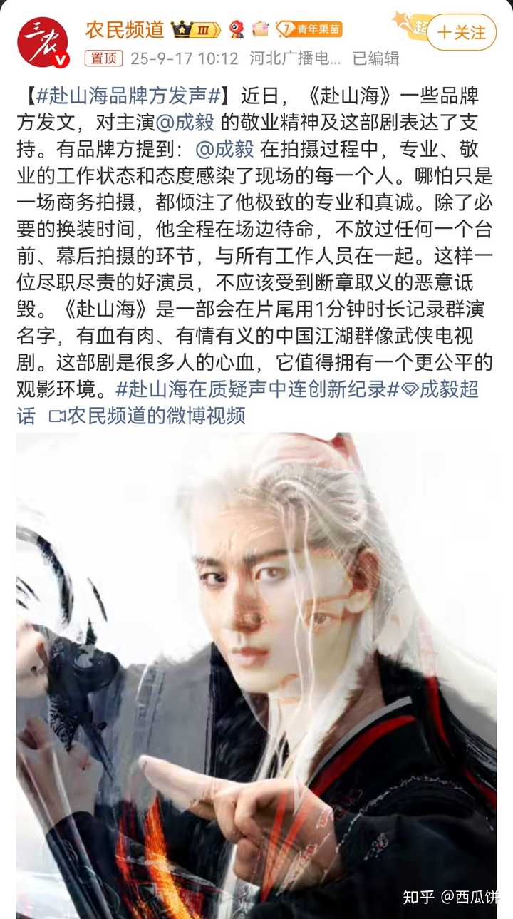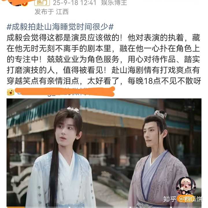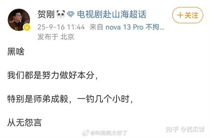 为什么都要骂成毅? 这不是成毅的错。 这部剧,明显是唐周、渣爹、司凤、相夷的拼盘。 人家剧方,都快把想挣快钱顶脑门上了。 成毅一脸的被绑架的打工人。 他曾经多么活泼开朗的人,而且还曾经走过猛男路线,现在人设是社恐老干部、人形哈基米,真的是他本人意愿吗? 那个二哥,在《卿卿日常》里面的演技正经不俗,这部剧里演的是个啥玩意儿,跟个新人二愣子似的。 着急回去救爹娘,恨不得演了十几集还没回去,这能怨得了成毅? 什么是好演员? 《莲花楼》那种整体不错的剧,人家给你演好。 《沉香如屑》那种剧情很单薄的剧,人家给你挽救,渣爹演技炸裂。 这部《赴山海》一股子国企味儿,一堆人,忙忙叨叨的,也不知道干了个啥,反正时间耗过去了。 这玩意儿,是一个技术骨干,能够改变的吗? 那些穿帮镜头,怎么还能怨演员不敬业呢? 导演在监视器前过了,演员一条一条去盯着吗? 当然确实有些演员比成毅做的好,有那认真的会一点一点的抠细节。 但是,这是个整体氛围的问题,一个明摆着圈钱的项目,草草了事,你去抠细节,不是显得缺心眼嘛! |